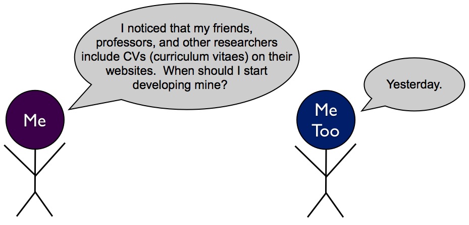 ME TOO: Yeah, the two are very different. My understanding is that a CV is the academic version of a resume… it is a diary of all of your academic achievements, big or small, that you have made in the most recent years. It’s something you regularly add to over the years and so it grows and grows and grows. Ultimately, you will use it when you apply for faculty positions and grants. While a graduate student, you will use it regularly when applying to workshops, fellowships, postdoc positions, and more.
